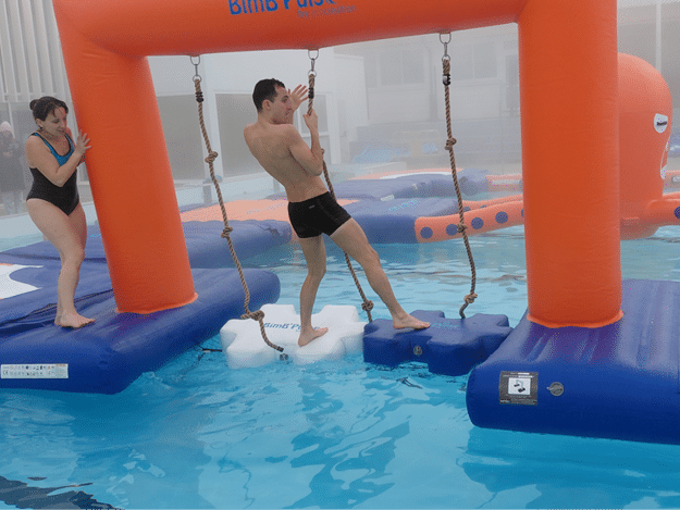 Le Monkey Arch’ se place au sein de votre parcours aquatique. Ce module gonflable pour piscine met votre endurance à l’épreuve : à vous de le traverser à la seule force des bras !
